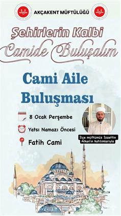 Akçakent Müftülüğü olarak, birlik ve beraberliğimizi pekiştirmek, ailelerimizi aynı manevi çatı altında buluşturmak amacıyla Camii Aile Buluşması programı düzenliyoruz. Bu anlamlı buluşma, ilçemizin kalbi olan Fatih Camiinde gerçekleştirilecektir.
