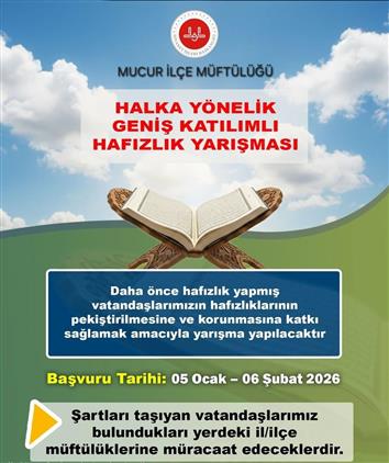 Şartlardan; Türkiye Cumhuriyeti Vatandaşı olmak ,01 Ocak 1996 tarihinden önce doğmuş olmak,Diyanet İşleri Başkanlığında çalışmıyor olmak,Diyanet İşleri Başkanlığında emekli olmamış olmak,Daha önce Diyanet İşleri Başkanlığı Hafızlık yarışmalarının Türkiye finallerinde yarışmamış olmak şartları tutan vatandaşlarımızın ödüllü olan yarışmaya 05 Ocak -06 Şubat 2026 tarihleri arasında ilçe müftülüğümüze müracaat etmeleri rica olunur.
